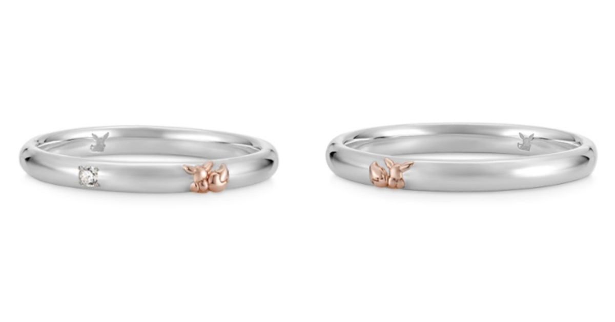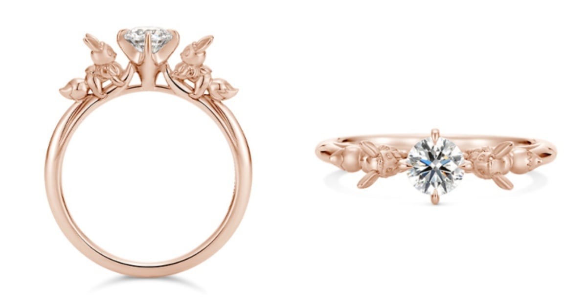 這款「伊布鑽石婚戒」的中央,兩隻伊布在旁邊遙遙對望,牠們可是一對甜蜜的CP,一隻尾巴是鋸齒形花紋,另一隻則是心形花紋的雌性,象徵往後人生即將「雙數一起走下去」,能進化成多種屬性寶可夢的伊布,也代表著彼此的愛情進化成更深層次,一共有18K玫瑰金、18K黃金、白金、銀搭配玫瑰金以及白金結合玫瑰金款式選擇。