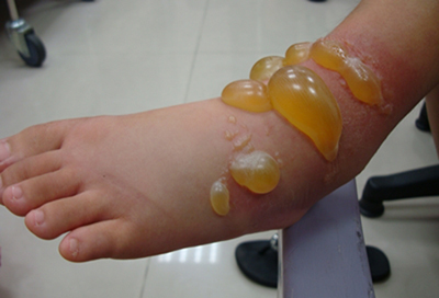 女大學生穿高跟鞋走路不小心扭傷左腳踝,前往國術館敷草藥,起先感覺皮膚開始發熱,接著有癢感,且被告知需敷藥4小時,原以為是藥效發作而忍住不適感,沒料到才敷藥半小時後實在覺得很不舒服,將敷藥處撕下,腳踝起了一粒粒巨大水泡看起來好像是隻氣球狗,嚴重發炎的地方紅腫、熱、痛、起水泡,就是所謂過敏性的接觸性皮膚炎