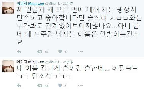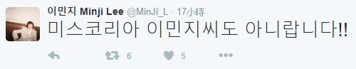 她還幫同名的2015年韓國小姐得主李敏智喊冤:「韓國小姐李敏智也不是參與賣淫的女子啊!」
