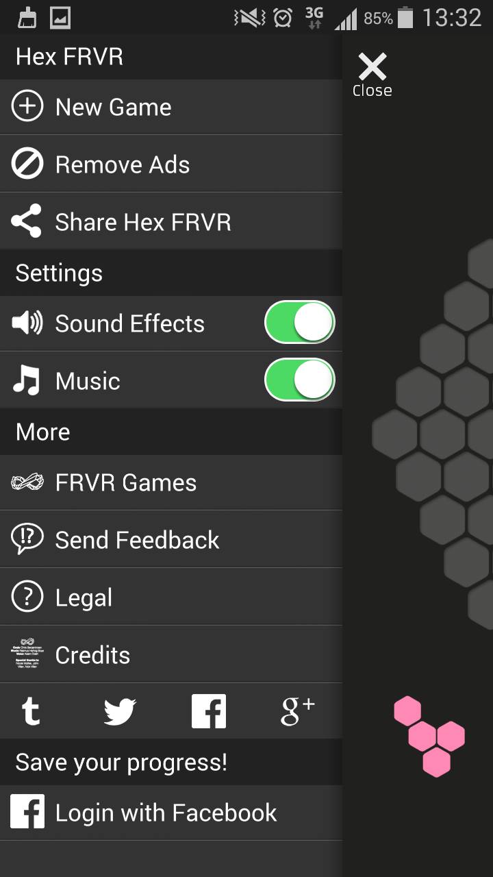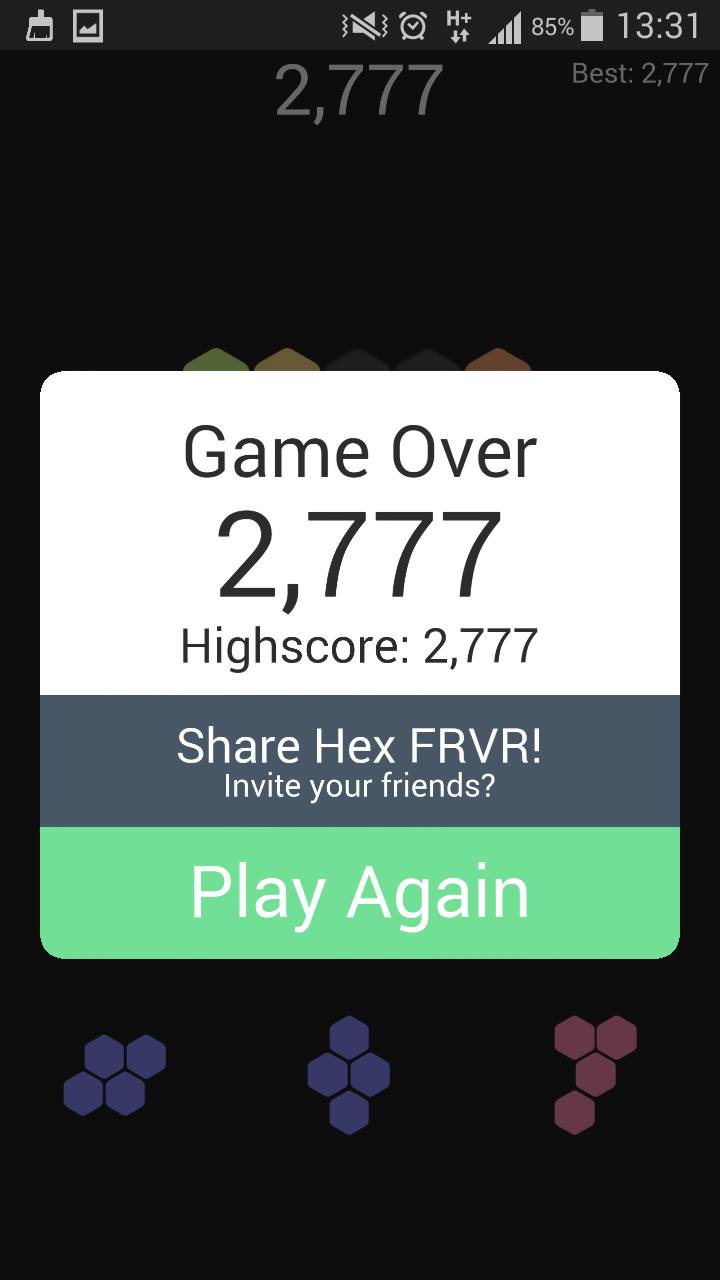 《Hex FRVR》是一款有點類似俄羅斯方塊的遊戲,不過背景是六邊形,只將使用隨機跳出來的圖形連成任何一線即可消除。這個遊戲沒有時間限制,不過如果你已經沒有任何空間可以放圖形的話就會Game Over。