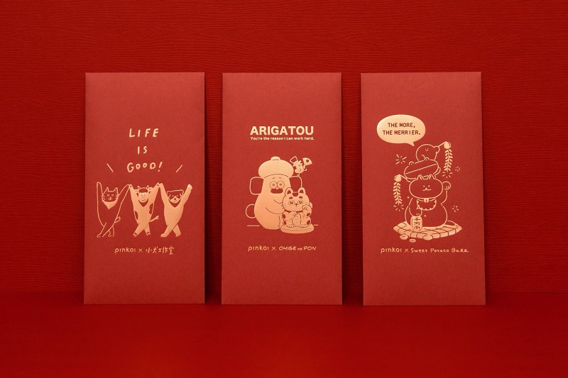而Pinkoi在2021年,邀請了台灣插畫家小犬工作室、地呱球,以及日本知名插畫家胡子碰碰,共同聯名推出新春紅包袋與春聯,以「Give and Take」作為主題,期望能透過四個可愛角色的圍爐場景,帶給大家滿滿的暖意!尤其紅包袋的燙金質感,和春聯上的可愛彩圖,根本捨不得送出去只想自己收藏起來呀!