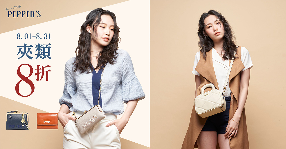 閃耀夏日,就從PEPPER'S鍊鍊時尚開始! 這個夏天,PEPPER'S陪妳一起「鍊鍊時尚」!即日期至9月底止,單筆結帳金額滿NT$5,000送PEPPER'S REESE金幣手挽練,滿NT$8,000就送妳防疫新生活最具心風潮的DONG-DONG動動隨行鞋形收納袋(同時升級 VIP);為鼓勵椒粉們動起來,動動隨行鞋形收納袋即刻享有入手價$399的超值優惠(原價$780)!今夏想為自己做出不一樣的時尚心改變,絕不能錯過8月1日起至8月31日止的夾類全面8折優惠! 從今天起,和煩悶心情說BYE BYE、一起享受超組搭的精采生活!