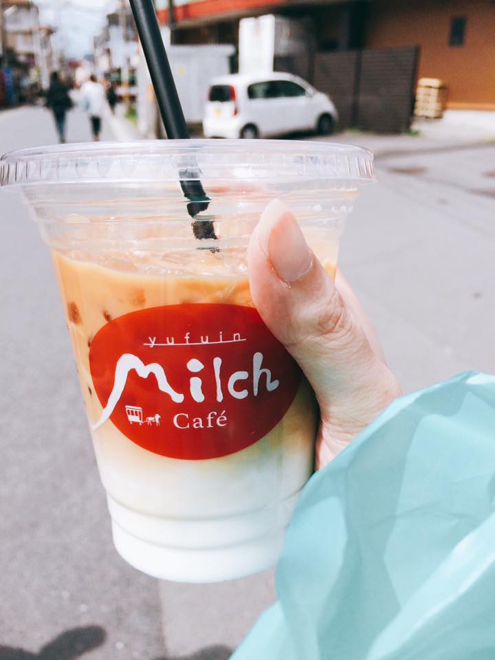 接著是有在販售起司蛋糕、布丁等甜品,同時也有販售咖啡、牛奶等飲品的雙店面「Yufuin milch」。這裡招牌起司蛋糕有分冰、熱兩種吃法,口感不同但一樣香濃。