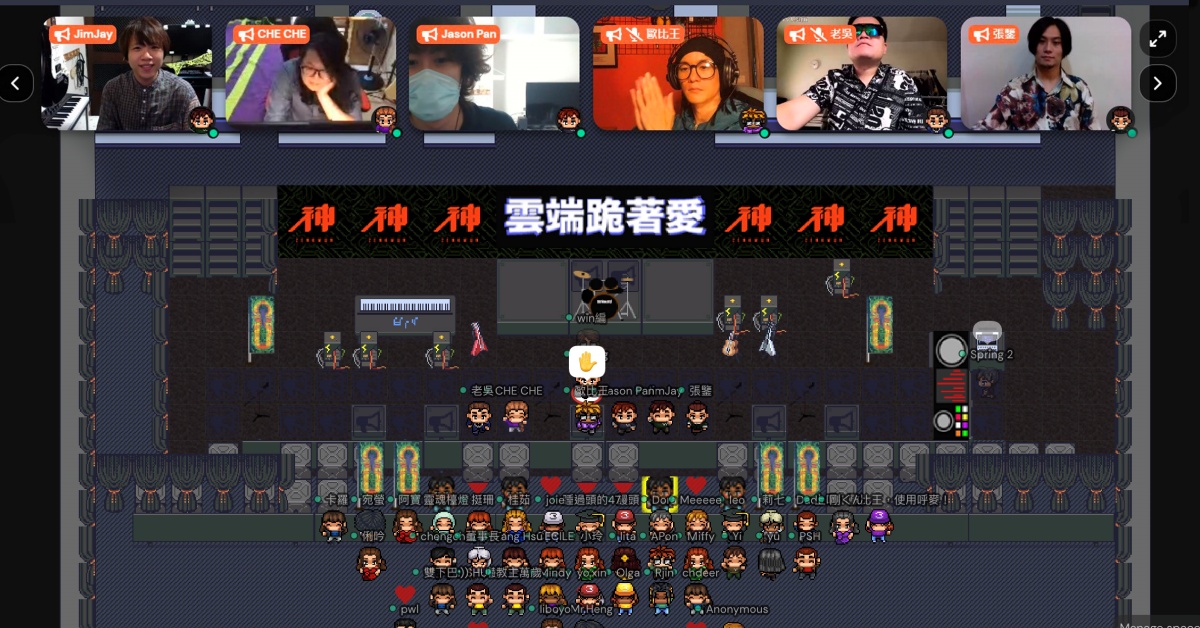 神棍樂團昨日下午在「Gather town」舉行「雲端跪著愛」,不僅神還原台北Legacy場館,更蓋了兩大展覽區,釋出15張未曾公開過的高清演出圖,甚至將教主防疫宣導化為神柱,場外週邊販售區也擺得有聲有色,讓粉絲們逛得津津有味,直呼策劃團隊太用心!神棍樂團大大感謝Windie Music的夥伴:「經紀人Spring與企劃Hsuan打造這個神一樣的平台,對樂團來說非常新鮮,很像回到小時候徹夜打神奇寶貝的時光!」建造線上場館的Spring和Hsuan也笑說,感謝樂團讓他們WFH還可以正大光明的「打遊戲」。