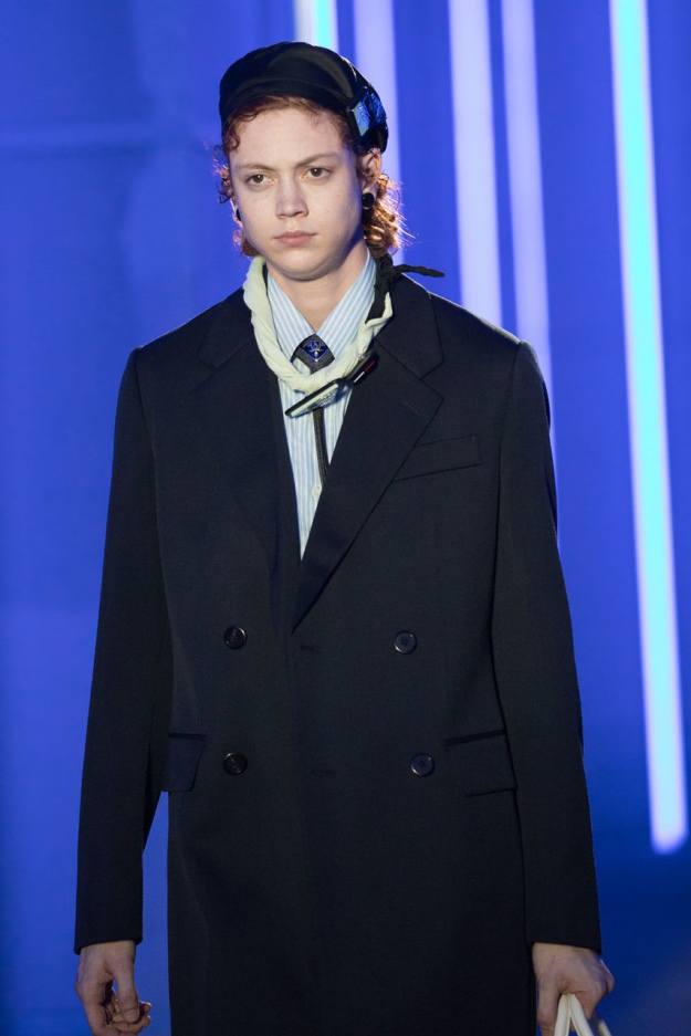 以往Prada的設計不喜歡Logo太明顯,但這次一反往常,男裝的飾品搭配使用了相當多Logo的配件,像是襯衫的繩結、領巾上的別針等,這麼多Logo戴在一起很高調,但也很有造型感。