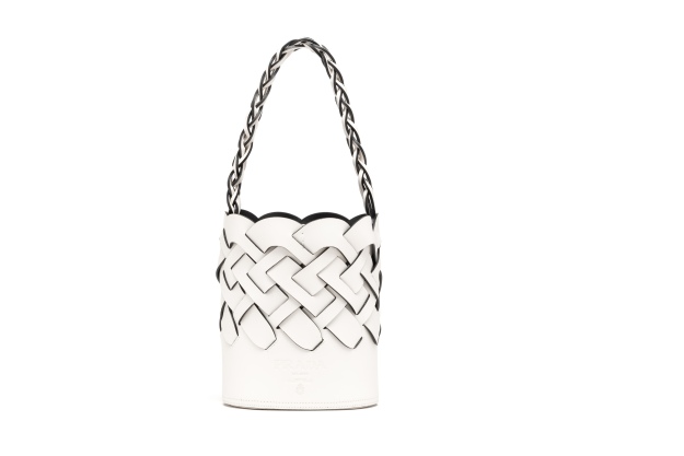 另一款呼應減少使用金屬釦飾的概念,品牌推出一款皮革編織的水桶包,有白色、黑色、棕色可以選擇,內裡還附有一個小方包可以裝雜物,推薦給想購入Prada包的妞妞們!