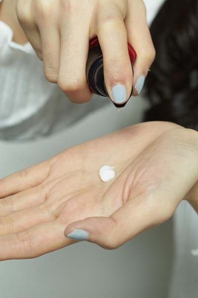 2取一顆花生米大小的保濕護髮素,讓頭髮維持滋潤光澤。如髮絲還是很乾,可分層塗抹半顆花生米的量。