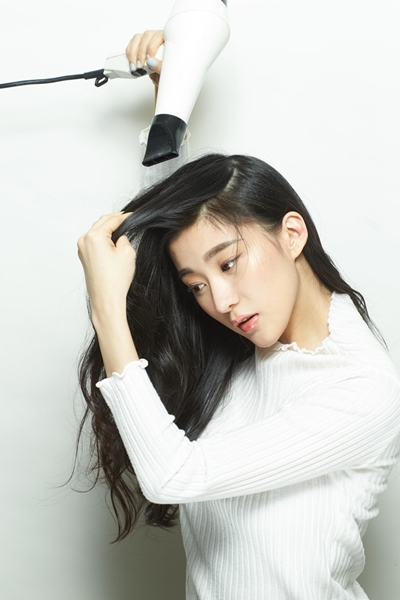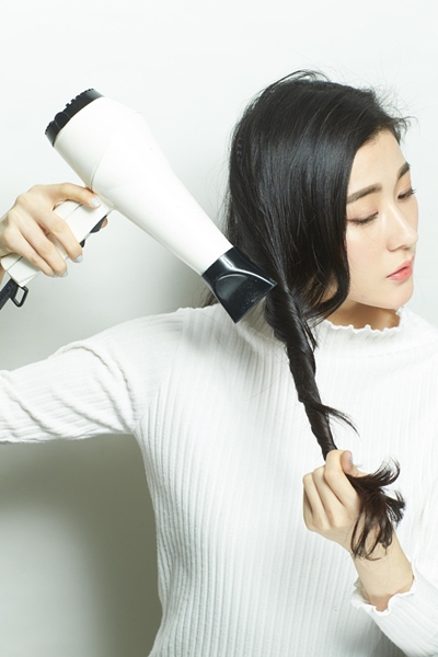 4將著把後面的頭髮一邊往前撥、一邊往前吹乾,注意要逆著髮流才會有蓬鬆度。