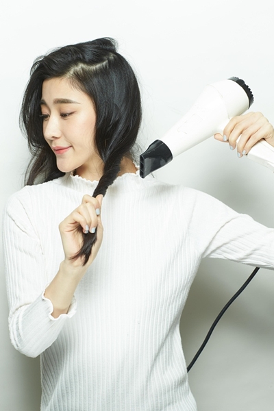 3使用吹風機的熱風,將頭髮用手指捲起來,並且一邊往前捲、一邊吹乾頭髮。