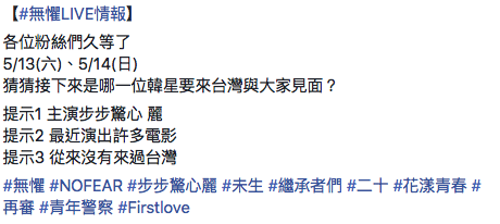 妞妞們注意了!5月13日和5 月14日即將有大事發生?!無懼公司在FB上公開,即將有韓星來台跟大家見面,不過這次不是直接跟妞妞們說誰要來台噢!主辦方釋出了三個提示,要大家一起猜猜看~(好像滿有趣的?)