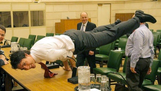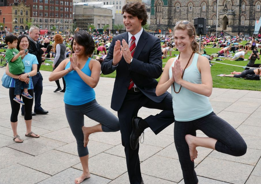 賈斯汀杜魯道曾在twitter上發了一張瑜伽動作的照片,受到瘋狂轉載。在某個會議的中場休息時,他穿著白襯衫與西裝褲,在桌上就做起了「孔雀式」瑜伽,只靠雙手支撐讓身體抬離至與地面平行,超Man!