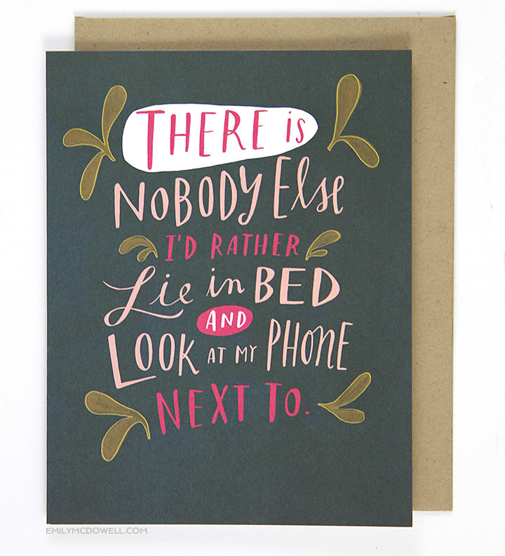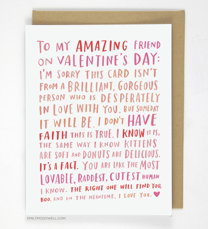 「給我最棒的朋友:很抱歉,這張卡片並不是來自你熱戀中的那優秀又有吸引力的情人,但有一天你也會收到的。我不是有信心,而是這本來就是真的。就像我知道貓咪很柔軟、甜甜圈很好吃一樣,它就是事實。你是我見過最有愛心、最完美、最可愛的人了!對的人終究會找到你的~而在那之前,我愛你❤」