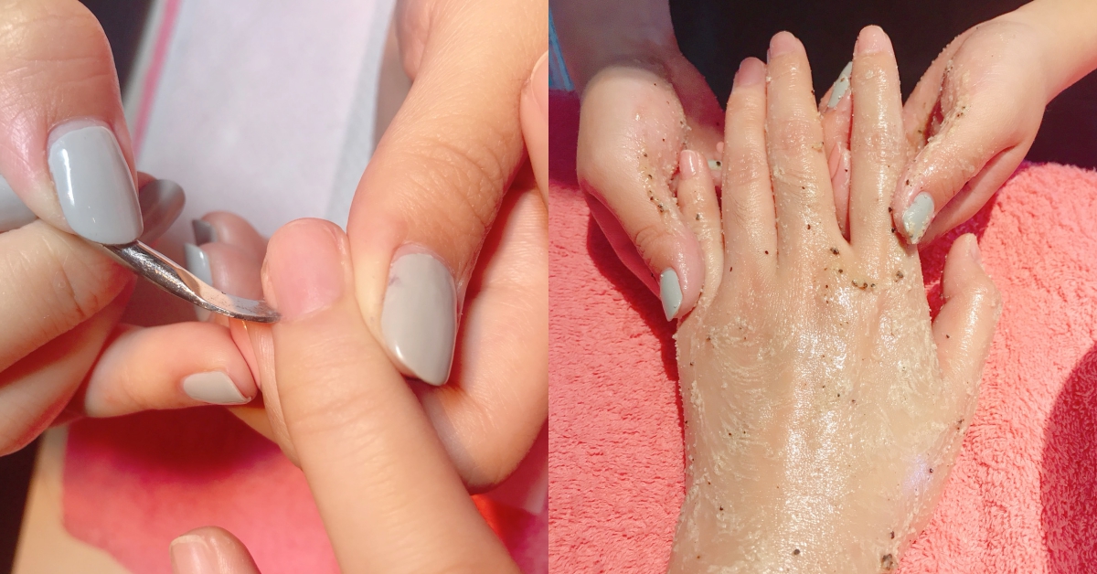 美甲師會先進行修型、去甘皮、硬皮、去角質的動作,光是做完這些基本的保養,其實手就摸起來很嫩,甲面也變得很光亮!