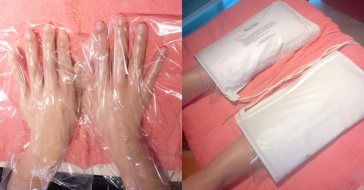 泡完蜜蠟後,美甲師會幫你雙手套上保鮮袋,接著放入加熱墊,藉由熱導入幫助蜜蠟的養分能夠完全被肌膚吸收,大約加熱10~15分鐘。
