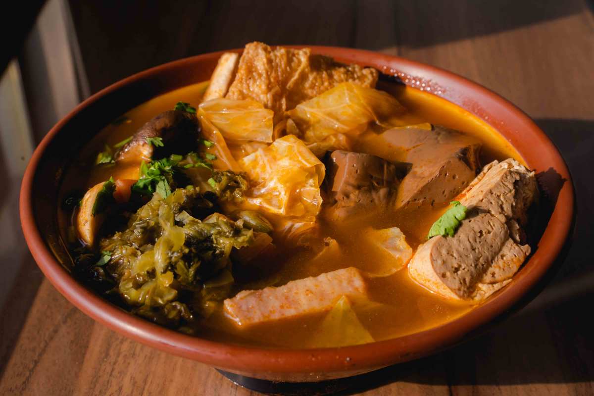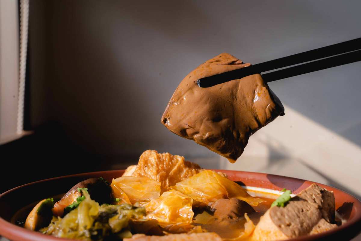 由蔬菜、金針菇、豆皮、招牌鴨血、豆腐所組成的「麻辣綜合煲」也是必點料理之一,麻辣湯頭是由當歸、枸杞、黨蔘等中藥材熬煮,清香不死鹹,怕辣的人也不用擔心,湯頭屬於麻而不辣類型,整碗吃完都可以不用配水。鴨血部分滑順入味,豆腐中間的孔洞也是吸滿精華,飽足感瞬間upup!(有料理包可以宅配購買)