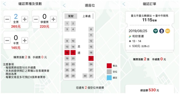 訂票程序很簡單,選擇起始站與終點站、時間與客運公司(可選單一客運或兩家以上),台北發車部分,除了台北轉運站之外,也可以選擇景美、市府或科技大樓站。按下搜尋之後,App就會跳到車次資訊頁面。車次頁面完整顯示了發車時間、客運公司、票價、剩餘空位、車上設備(WiFi、廁所、充電座等)與票價。想比較哪家客運不必再慢慢查,這個頁面直接讓你一目瞭然!(這個功能很有感啊~超讚)
