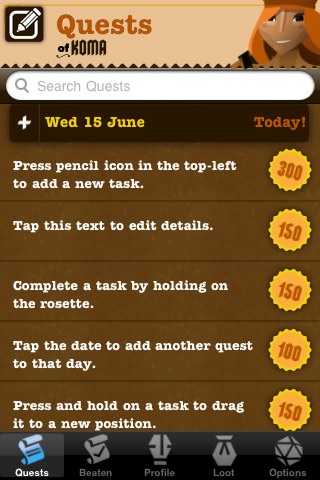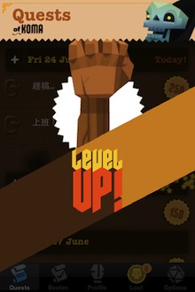如果真的這樣交稿Koma就要窮途潦倒了..總而言之呢,EpicWin的概念就是把生活中的大小事變成RPG冒險中的各項任務,在完成一項工作之後只要長按該工作右方寫著數字的徽章,你的阿凡達就會衝出來拳打腳踢一番,待工作灰飛煙滅之後就得到獎賞啦!