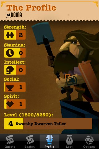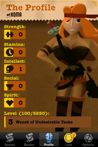 Profile自然就是角色檔案了,可以看到自己的阿凡達威風凜凜的站著,同時左邊列出各項能力值的鍛鍊情形。隨著等級與各項能力的提升,角色身上的裝備等也會跟著升級。瞧那一身破爛的打扮,EpicWin簡直是十年養成計畫嘛!