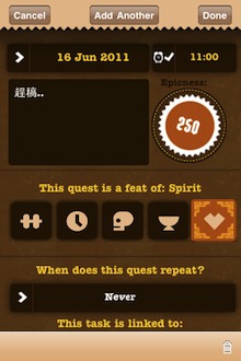 出了新手村之後就得開始面對這個世界的險惡了。按一下左上角的鉛筆圖案可以進入到編輯畫面,把各項工作行程任務meeting通通key進去吧!基本設定就像一般的行事曆一樣,日期時間循環提醒樣樣不缺,差別在於多了經驗值與修練類別的設定。當然類別的安排都是自由心證的,而適當的安排可以讓阿凡達與你的生活更接近哦!