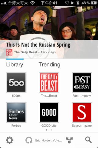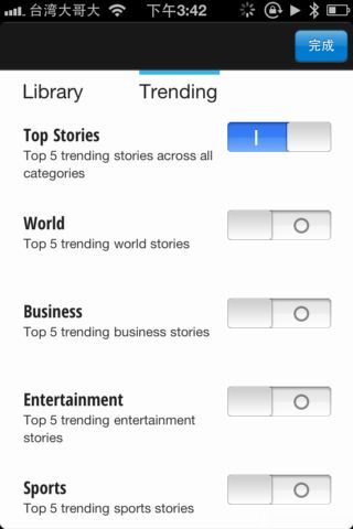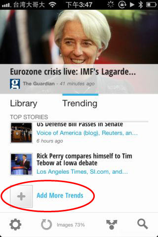 此外Google Currents當中還有Trending頁面。裡頭的內容是Google透過自家的搜尋引擎,在每個小時為你呈現某類別當中最紅的五條新聞,讓你短時間之內就可以掌握最新的資訊。
