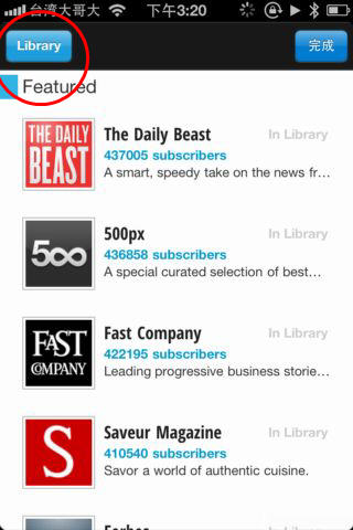 其中在這些類別之內,最特別的就是「Curators(館長)」類別,主要是蒐集一些訂閱數量很高的個人部落客。在挑選到想要訂閱的內容後,即可按下Add按鈕加入My Library當中,加入成功後會顯示「in library」的圖示。