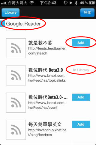 在Google Reader頁面中,你可自行選擇想下載到手機當中來閱讀的訂閱項目。所以只要你能訂閱到Google Reader當中的資訊,都可以透過Google Currents隨時閱讀,還滿方便的唷!