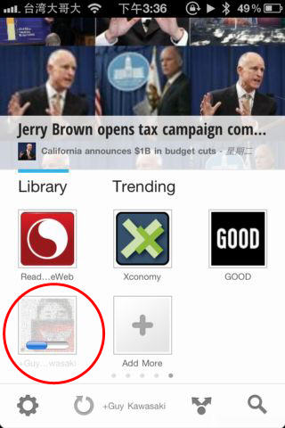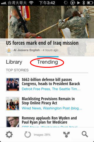 完成了My Library、Google Reader的訂閱及Trending的設定後,就會看見Google Currents認真的在為你下載豐富的資訊了!