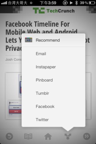 此外,Google Currents想當然爾也有搭配社群分享的功能,好讓我們能夠將所看見的新知分享給朋友!若是看見想要分享的優質文章,按下Google Currents內建的分享按鈕並選擇要分享到的網站即可(包含Instapaper、Pinboard、Tumblr、Facebook及Twitter),當然也可以按個+1囉!此外,當然也能以Email來分享。