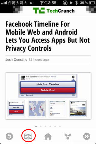 閱讀文章的時候,Google Currents所提供的是以手指滑動左右翻閱的方式,每篇文章頁數的顯示方式以類似於iOS主畫面下方的原點來呈現。若您只想要閱讀你所感興趣的文章,則可以在文章中,按下下方工具列裡的書本按鈕,透過類似目錄的選單,直接跳轉到其他的文章進行閱讀。