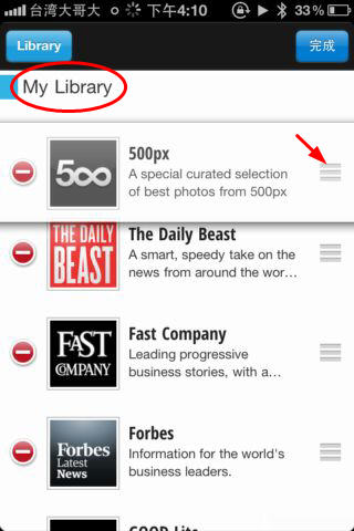 或者可以進入到My Library當中,進行刪除。在此處你也可以針對閱讀習慣來調整頻道的順序。