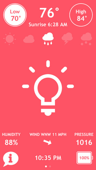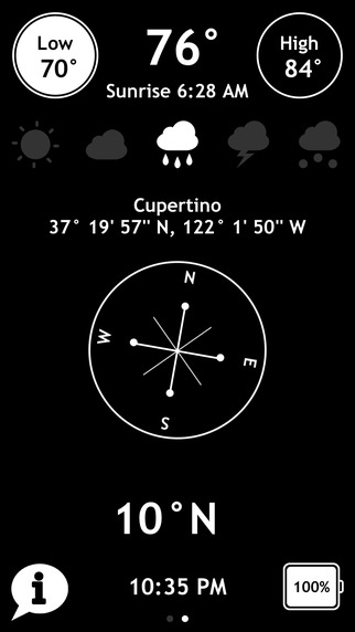 《Shake!》是一款介面簡單但功能多元的氣象資訊App,除了基本的氣溫、天氣狀態,還有氣壓、座標、指南針,連電池電量、月亮變化和日照時刻都有顯示,搖一搖還可以開啟手電筒呢!