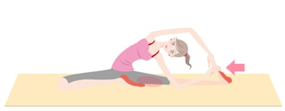 坐在瑜珈墊上,雙腿向外打開,右腳往內收,我們先向左邊傾。同樣的,你也能感覺到左大腿肌肉會痠痠緊緊的。