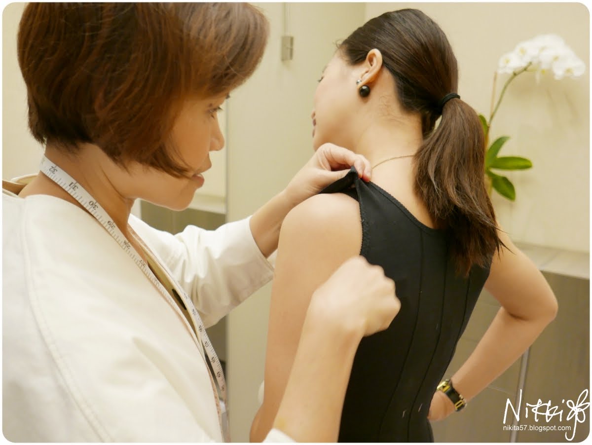 請我穿上塑身衣以後,讓她來看看到底需要修改哪些尺寸。