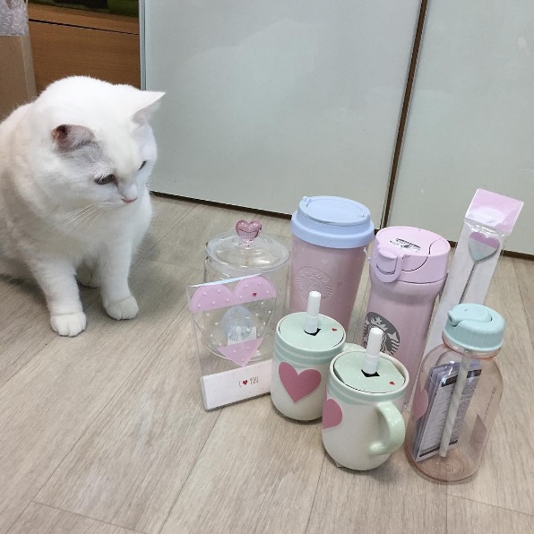 韓國星巴克除了推出情人節系列商品搶劫少女財之外,商品其實還有小巧思,注意一下(注意力都被可愛的貓咪吸引走了啦)前方的愛心馬克杯,上面是不是插了一枝筆呢?