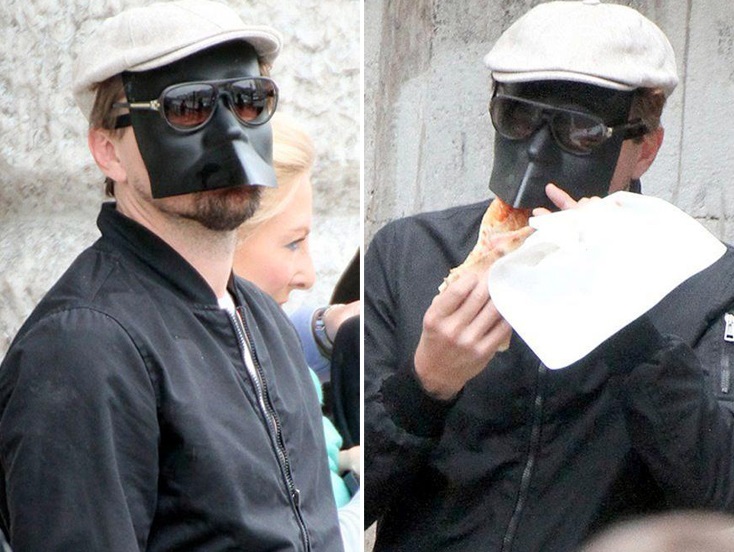 在與狗仔的攻防戰中,李奧納多花費了許多心思啊...不管是用外套棒球帽遮蓋全臉,還是用雨傘包住自己的頭,甚至是戴上面具(連吃Pizza都不肯拿下來),狗仔都還是能發現這位影帝。目前比數3:0,李奧納多大輸。