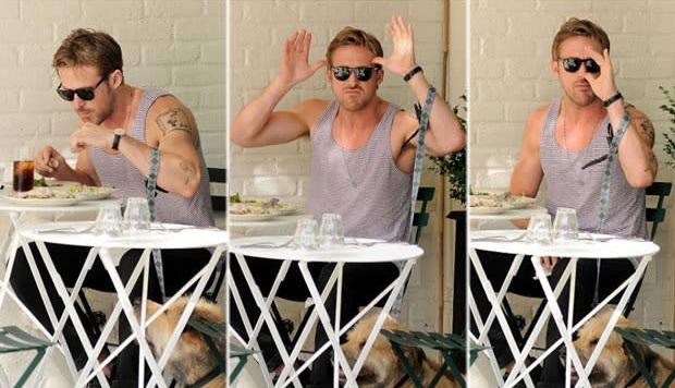 在一般情況下,實在是很難看到男神做鬼臉,不過雷恩葛斯林可能是個例外。遇到狗仔偷拍的他,選擇的抗議方式就是做鬼臉,難道他不知道這樣會讓狗仔拍更多照片,造福廣大女粉絲嗎?(妞編輯:「狗仔先生,請你多拍幾張吧!」)(<<欠揍)