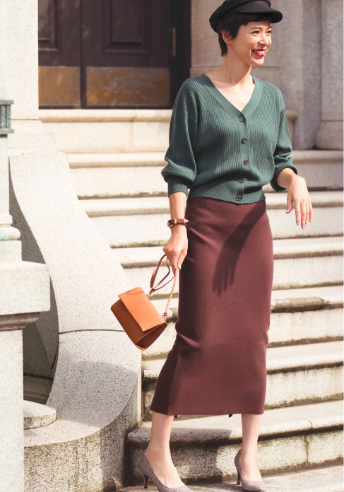 最後一套則是日系女孩必備的針織外套+窄裙!穿上去整體氣質度大飆升,給人溫柔的形象,不但可以單穿也適合做外搭的小外套,處在氣候不穩定的夏秋之際,有它協助怎麼搭都很fashion。唯美的褐色窄裙更讓整體多了女人味呢~