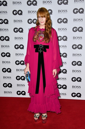 Florence Welch穿著GUCCI2017早春杜鵑紅荷葉邊剪裁絲質洋裝,輔以湖水藍色虎頭裝飾晚宴包及銀色高跟鞋,搭配GUCCI Flora 18K玫瑰金鑲嵌粉紅色琺瑯及藍寶石戒指、GUCCI Flora 18K黃金鑲嵌鑽石及藍寶石骷髏頭造型戒指,及18K玫瑰金鑲嵌鑽石及琺瑯藍寶石虎頭造型戒指。