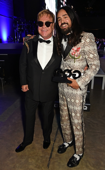 Sir Elton John(艾爾頓·約翰爵士)穿著GUCCI Signoria刺繡晚宴西裝,輔以白色晚宴襯衫、黑色緞面領結及黑色漆皮皮鞋。Elton John並頒發獎項予Alessandro Michele。