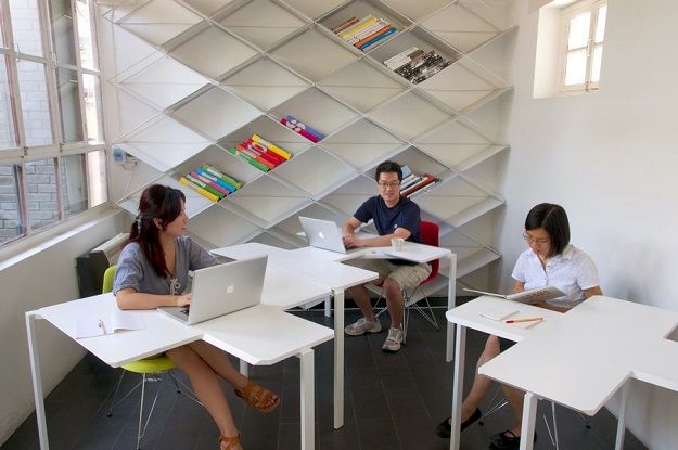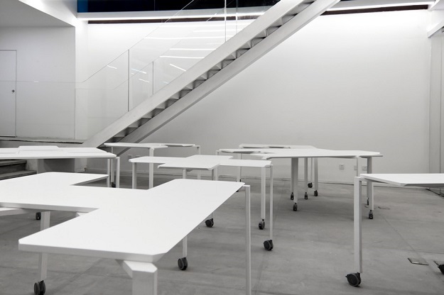 北京眾建築旗下的北京眾產品所設計的「凹凸桌」,以因應現代企業快速變形的需求,團隊須保持高彈性、高機能性,這款桌子基本上以5張為1組,透過桌面倒斜角邊的凹凸接口,就能夠輕鬆組裝各種桌型,不論是單人作業或是團隊報告都可以!