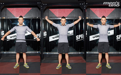 雙手抓住槓鈴最遠端的位置,保持手肘打直不鎖死。慢慢將雙手往頭頂上方舉,接著延伸到身體後側,最後再回到胸前位置。注意肩膀如有受過傷則要避免過度拉扯,以防脫臼狀況產生。反覆操作二十次。