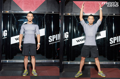 預備時呈站立姿勢。向上跳躍同時兩腳打開、兩手於頭部上方,再跳躍回到立正姿勢。跳起時雙腳張開幅度需大於肩膀,腳掌1/3著地膝蓋保持彈性微彎不鎖死,往外跳吐氣,收回時吸氣。反覆操作20下,三組一循環。