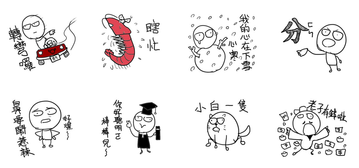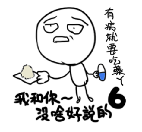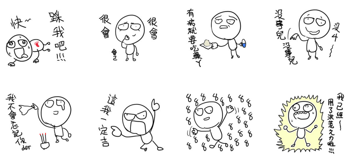 雖然線條很簡單,但只要一看文字就知道有沒有,果然是「很會、很會、會喔」的貼圖。看著他一會兒說「沒事兒~沒事兒~沒4」,一會兒又說「我已經用了洪荒之力啦」,手機小姐只想回送他一句「有病就要吃藥ㄚ」。(8888888)
