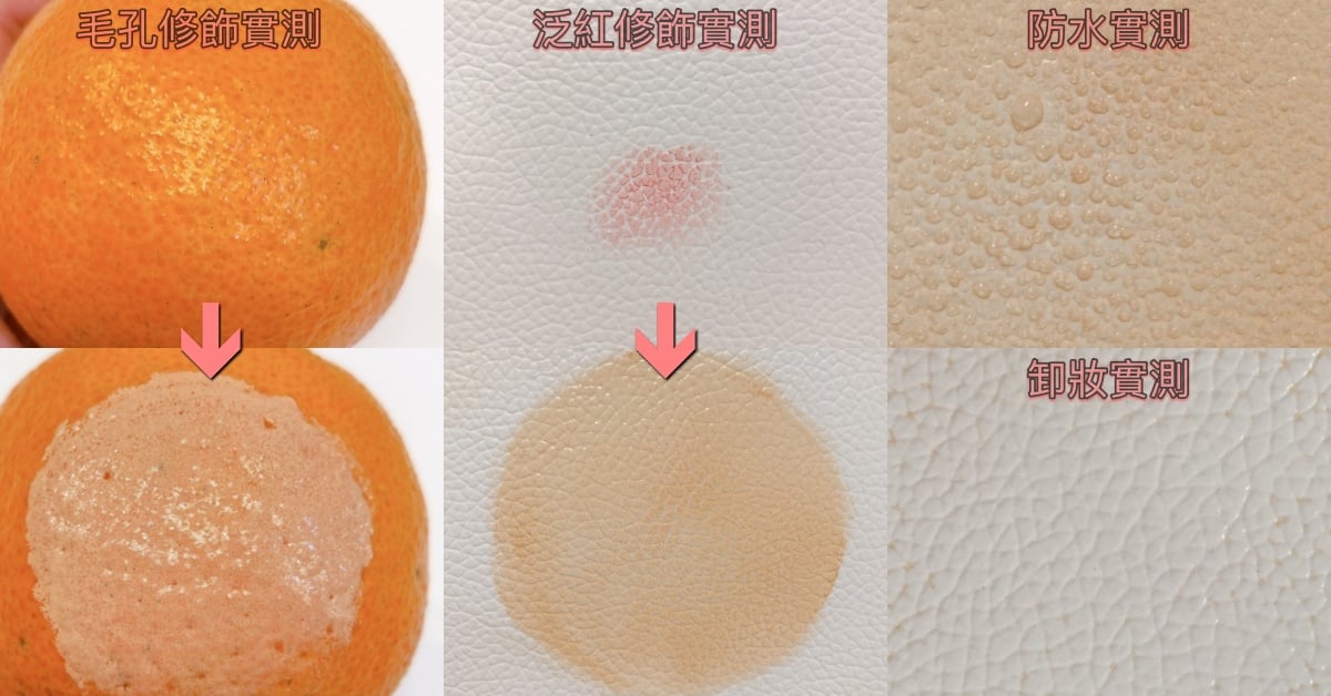 #防水實測:以噴瓶噴灑1次的水量,3分鐘後觀察底妝融水狀況。