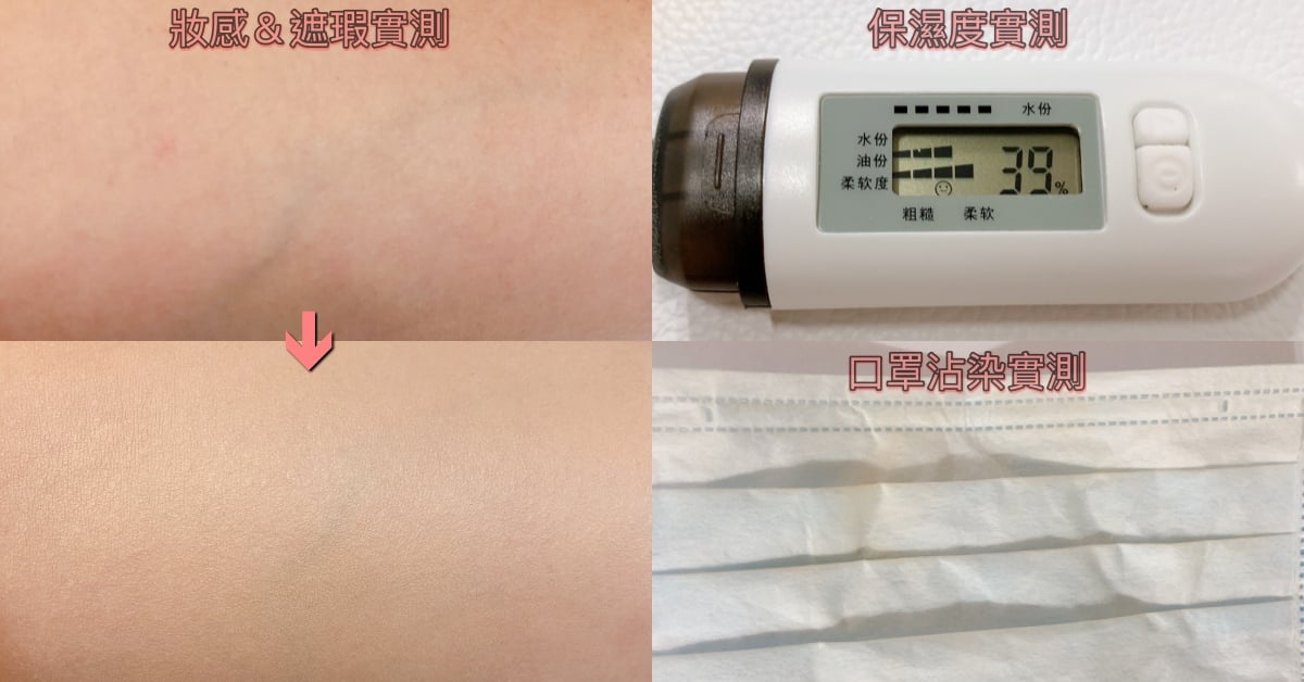 #口罩沾染實測:實擦於臉部上妝後戴上口罩1小時,觀察底妝在口罩內側的脫妝沾染程度,測試其持妝力。