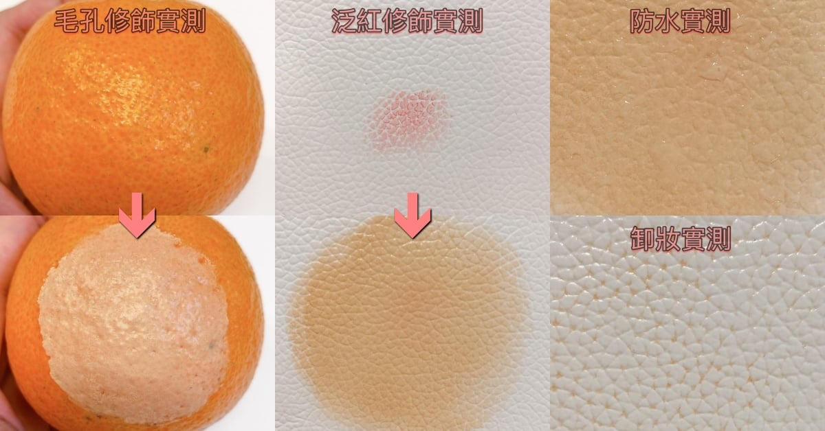 #毛孔修飾實測:以橘子模擬肌膚毛孔,拍按3下氣墊粉底於橘子皮表面,測試毛孔修飾力。