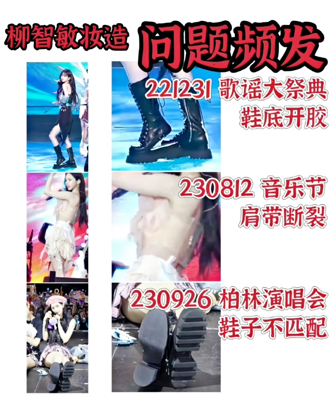 影片一曝光立刻掀起廣大討論,同時也讓大批粉絲又驚又怒,原來這已經不是SM娛樂合作的造型師團隊第一次出包,早在2022年的《MBC歌謠大祭典》上Karina就被捕捉到在演出時「鞋底直接開口笑」,接著在隔年的音樂節「間帶斷裂」、演唱會上給錯鞋子、《KBS歌謠大祝祭》肩帶破損,甚至在錄製《人氣歌謠》時,被Karina發現「袖套上插著針」,高頻率連4出包掀起眾怒。