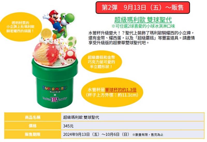 去年⼤受好評的「超級瑪利歐」聯名活動回來了!以⽤⼒量提升道具作為主題的新⼝味為⾸,本次活動還推出了多種以⼤家熟知的⾓⾊和道具為設計的聯名商品!此外,除了充滿個性的聯名商品外,以任天堂在2024年6⽉27發售的Nintendo Switch遊戲軟體《路易吉洋樓2 HD》為主題的31造型冰淇淋蛋糕也將於本次聯名活動登場。這個夏天,讓我們與「超級瑪利歐」的夥伴們在31冰淇淋⼀起享受無敵夏天吧!