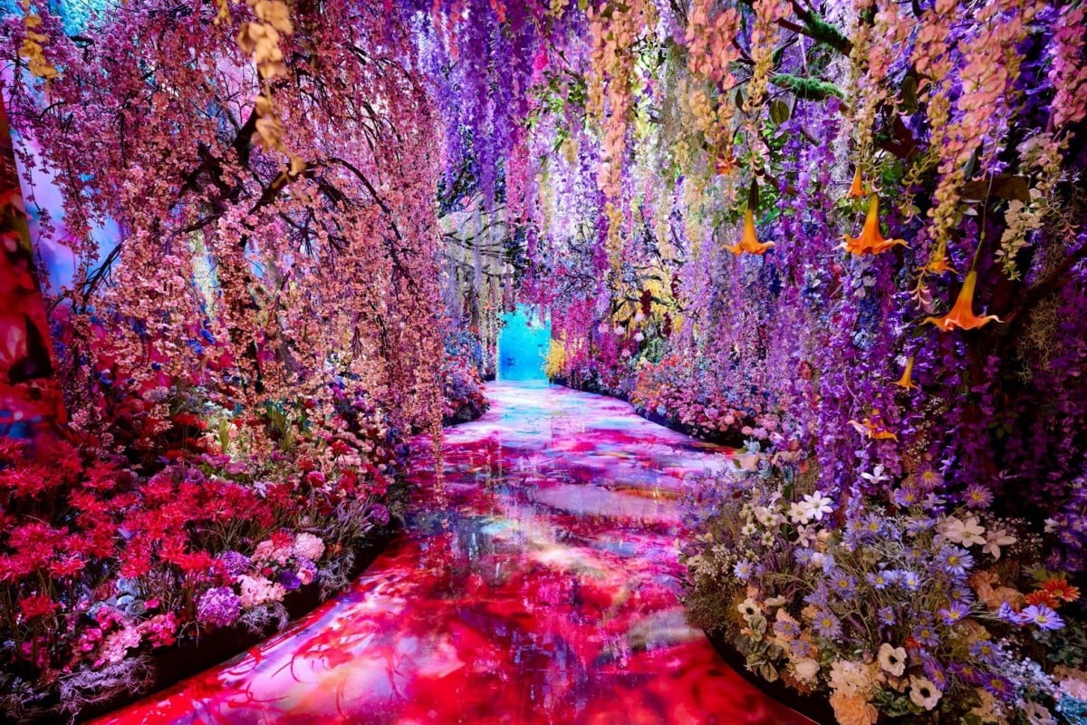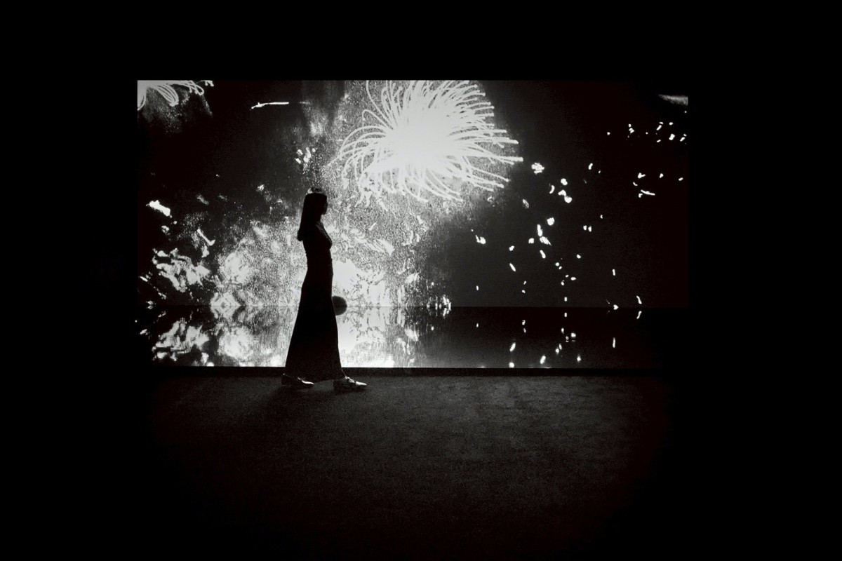 京都展人氣最高的《深淵彼岸的夢》,一踏入便能被盛開的花朵包圍,隨後即是由鏡面與巨型螢幕構成的720度全景空間。如雨般落下的櫻花、稍縱即逝的煙火、生生不息的蔚藍海洋等不斷變換的場景,如同走進無限延伸的深淵,沉浸在跨越生死、前所未見的彼岸世界。