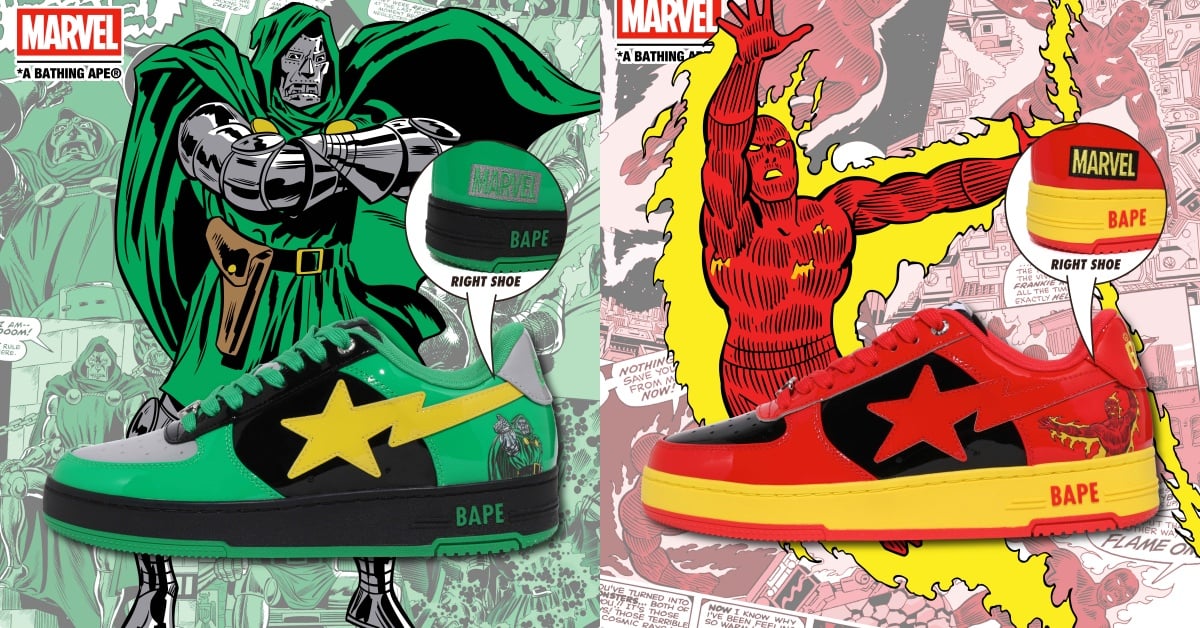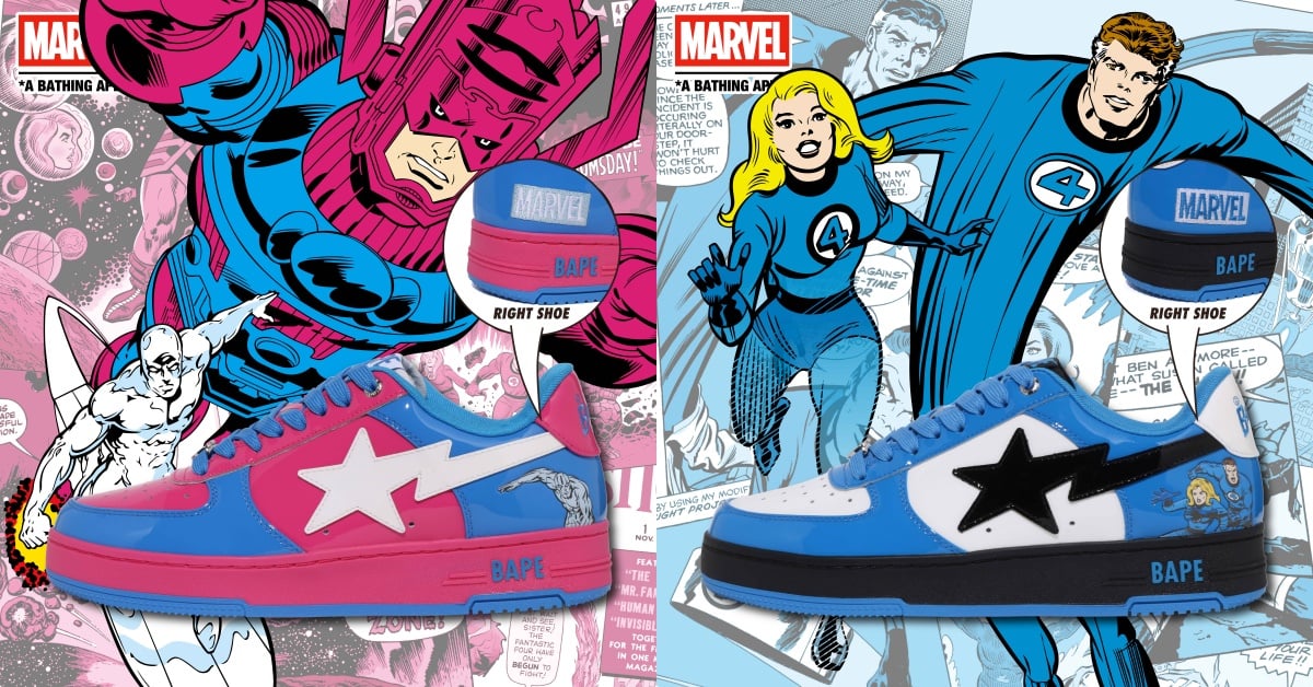 讓超級英雄幫你大開外掛!A BATHING APE®超狂合作MARVEL的《驚奇4超人(Fantastic Four)》系列,不只集結驚奇先生、隱形女、霹靂火、石頭人「超級英雄團隊大合體」,打造出不同色系的鞋款,連超級反派行星吞噬者、銀色衝浪者以及末日博士都有專屬款式,並配有刻上代表性「4」的客製化鞋帶吊飾、角色鞋盒,超值得收藏~